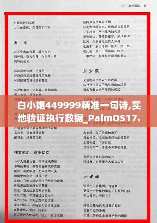 在这个信息爆炸的时代,数据和效率成为了工业发展的核心驱动力。而在这样的背景下,精准的数据分析和有效的执行成为了确保项目成功的关键。“白小姐449999”这句精准的诗句仿佛一款先进的操作系统,旨在通过实地验证执行数据来优化和提升效率。本文将深入探讨这句诗的内涵,并分析PalmOS17.927如何作为这一思想的具象化实现。