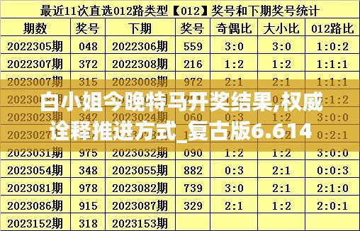 总之,今晚的白小姐特马开奖结果将成为彩民们关注的焦点。复古版6.614特马开奖不仅是一项数字游戏,更是一次文化和历史的传承。权威诠释推进方式的运用,为特马开奖结果的公布提供了可靠的保障。我们期待与您共同见证这一激动人心的时刻。